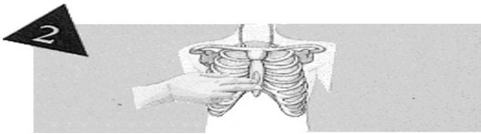 由病人的胸部(近施救者侧),找寻肋骨下缘,沿肋骨缘向上滑动,至肋骨与胸骨交汇的胸窝处,即为按压位置。